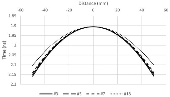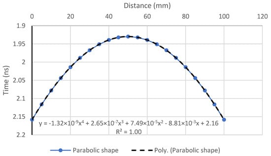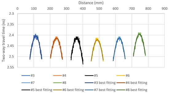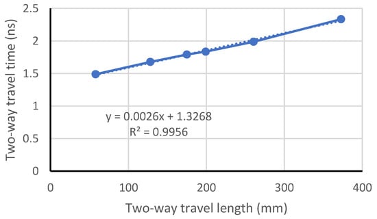 Figure 2 displays the best data-fitting curve utilizing Equation (2), with a time zero of 1.3268 ns. However, the calculated wave velocity of 1/0.0026 = 385 mm/ns is significantly higher than the electromagnetic wave velocity propagated in the air, which is 299 mm/ns.