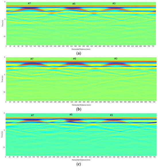 Radargram of slab specimens S1-1, S1-2, and S1-3. (a) Radargram of Specimen S1-1. (b) Radargram of Specimen S1-2. (c) Radargram of Specimen S1-3.