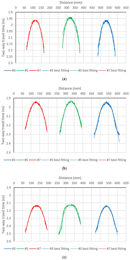 The shape of a hyperbola depends on two parameters [51]: (1) scan spacing, where a smaller scan’s spacing (more scans per meter) produces wide hyperbolas, and (2) wave velocity, where higher velocity (lower dielectric) produces wider hyperbolas and vice versa. Targets of larger diameter produce bright reflections. The shape of a hyperbola does not change significantly with target size for any diameter under 50 mm; all such targets are point-like for the radar as their size is a fraction of the wavelength.
