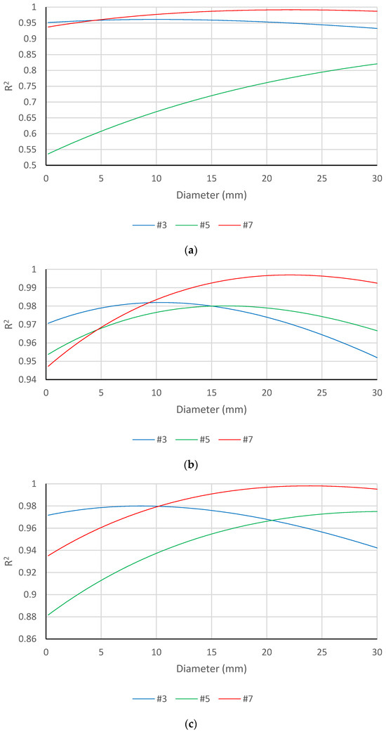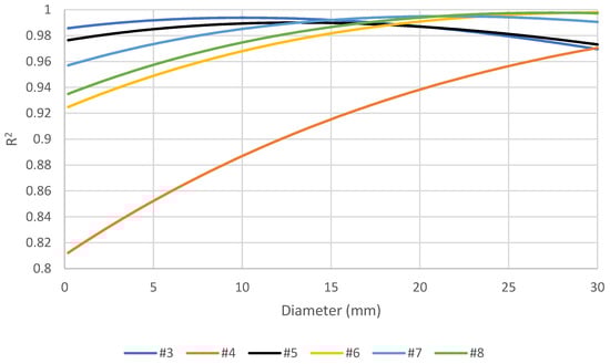 The wave velocity of 133 mm/ns is determined from the reflection of the bottom of the 89 mm thick slab. With this known wave velocity, the depths of the rebars can be calculated by utilizing Equation (5). Subsequently, the rebar diameter is estimated by identifying the diameter corresponding to the maximum R-squared values in Figure 10. This analysis provides valuable insights into the composition and characteristics of the slabs, aiding in further understanding and decision-making