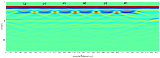 The radargram and hyperbolas of the rebars for the S2 slab specimen, subjected to a rigorous analysis, can be seen in Figure 11 and Figure 12, respectively. It is evident that the hyperbolas partially overlap due to the small spacings between them. To address the perception of overlap, the number of data points of the hyperbolas was reduced, effectively eliminating data points in the overlapping zone. However, while the diameters of rebars #3, #7, and #8 were estimated with very high accuracy, a lower accuracy was obtained for rebar #5. Additionally, the diameters of rebars #4 and #6 could not be approximated, as summarized in Table 4 and Figure 13.
