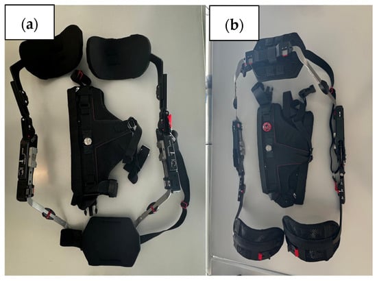 BExo used in the study; (a) back of the exoskeleton; (b) front of the exoskeleton.