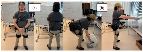 Procedure setup and task performance in the lab; (a) front and back view of the BExo; (b) tasks completed by the participants.