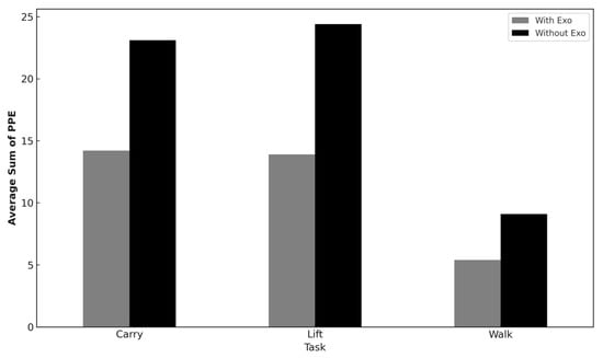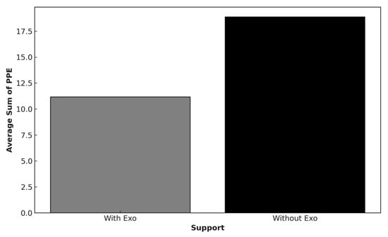 The one-way ANOVA (as in Table 2) for exoskeleton support showed a significant reduction in overall perceived physical exertion when the back-supporting exoskeleton was used, with an F-ratio of 8.07 (p-value of 0.0062, statistically significant at α = 0.05). This indicates that the differences in PPE with and without the exoskeleton were unlikely to be due to chance. The mean difference in the PPE scores between exoskeleton and no exoskeleton was 7.25, with a 95% confidence interval from 2.09 to 12.41, confirming significant differences. Therefore, there was a significant reduction in PPE when the tasks were performed with the exoskeleton, demonstrating its effectiveness in alleviating physical strain across various tasks. This highlights the potential of exoskeletons as an indispensable ergonomic tool in high-exertion settings such as manufacturing. The average PPE across all experiments is shown in Figure 3.
