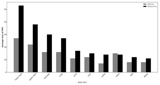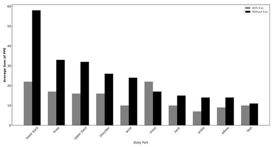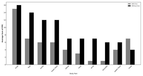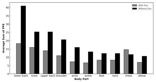 The comparison for the average sum of PPE with and without the use of an exoskeleton across different body parts is shown in Figure 4. The BExo significantly reduced the perceived physical exertion for several body parts. For the lower back, the reduction was substantial, with a decrease of 22.67 points, indicating a major alleviation of exertion. The knee showed a notable reduction of 9.33 points, and the shoulder a significant drop of 10 points. The upper back experienced a reduction of 9 points, while the ankle and wrist showed decreases of 6.66 and 5.33 points, respectively. The feet and elbow also benefited from the exoskeleton, with reductions of 4 and 3.67 points, respectively.