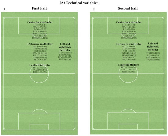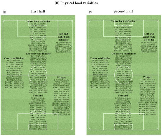 Afterwards, the data analysis relative to defensive midfielders and the technical variables revealed significant differences between halves in PPT, p < 0.01, d = 1.35, TT, p < 0.02, d = 1.10, R, p < 0.01, d = 1.13, RVM, p < 0.01, d = 1.06, RIB, p < 0.01, d = 1.18, RHI, p < 0.01, d = 1.32, TP, p < 0.01, d = 1.32, and TTOB, p < 0.01, d = 0.91. Subsequently, the analysis for physical load variables showed significant differences between halves in DC, p < 0.01, d = 1.54; SZDC1, p < 0.01, d = 1.53; SZDC2, p < 0.03, d = 1.41; SZDC3, p < 0.05, d = 1.02; SZDC4, p < 0.05, d = 0.89; SZDC5, p < 0.02, d = 1.31; ISCAD, p < 0.02, d = 1.50; HACC1, p < 0.001, d = 1.96; HACC2, p < 0.04, d = 1.96; HACC3; p < 0.04, d = 1.18, HACC4, p < 0.01, d = 1.48; ACCHI, p < 0.01, d = 0.84; HDCC1, p < 0.001, d = 1.56; HDCC2; p < 0.001, d = 2.47, HACCDC1, p < 0.01, d = 1.82; HACCDC2, p < 0.03, d = 1.30; HACCDC3, p < 0.001, d = 1.50; HACCDC4, p < 0.02, d = 0.63; DACCHI, p < 0.001, d = 1.47; HDCCDC1, p < 0.01, d = 1.16, and HDCCDC2, p < 0.001, d = 2.30 [Supplementary Materials (Table S5)].