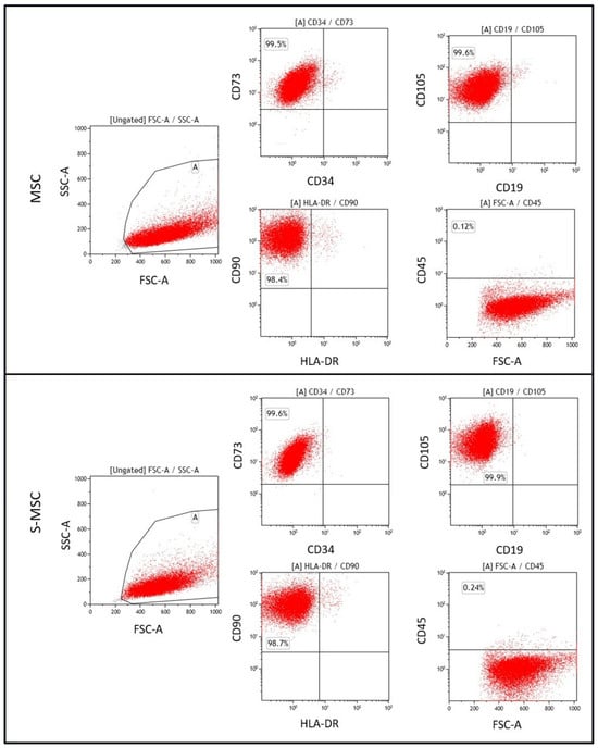 Flow cytometer analysis of MSCs and S-MSCs. Gate A defines MSCs according to their physical parameters (FSC-A and SSC-A). MSC and S-MSC stained with specific antibodies were positive for CD73, CD105, and CD90 and negative for CD34, CD19, HLA-DR, and CD45.