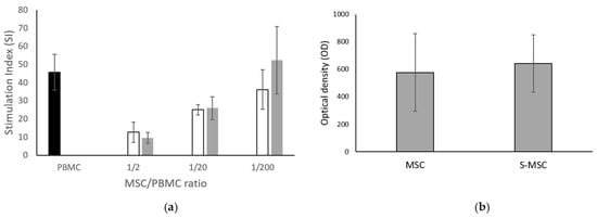 Moreover, S-MSCs maintained the in vitro immunomodulatory properties as those shown by their counterparts, without any significant difference between the groups. The capacity to downregulate the immune response, in particular, the activation of T lymphocytes by a polyclonal activator, is evidenced by the reduction in the stimulation index (Figure 3a).
