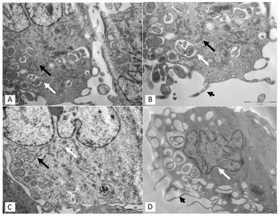 Representative TEM images of non-starved MSCs. (A–C) the cisternae of rough endoplasmic reticulum (RER) are clearly detectable (black arrows). In (A,B), different MVBs with a characteristic cup shape in the cytoplasm are contained within a membrane boundary (white arrows). (B,D) the protrusion of the plasmatic membrane (filopodia) is evidenced by arrowhead. In (C,D), a convoluted nucleus (black arrows) and some MVBs in (D) (white arrows) are also detectable. Bar = 2 µm.