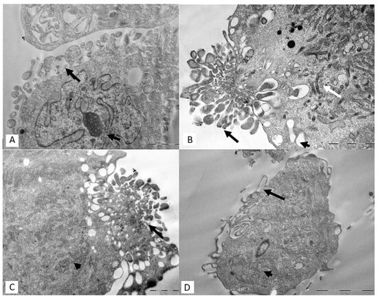 Representative TEM of S-MSCs releasing EVs after different times of starvation. (A) After 12 h starvation, EVs are detectable near the plasmatic membrane (arrow), and a nucleus with a prominent nucleolus is also visible (arrowhead); (B) after 24 h starvation, EVs protrude from the plasmatic membrane into the extracellular space; the heterogeneous population of vesicles is visible (arrow), and a dilated RER and some vacuoles are observed in the cytoplasm (arrowhead); (C,D) after 48 h starvation, EVs seem to be wilted, and there is a significant membrane blebbing (arrow); a RER with dilatated cisternae is also detectable (arrowhead). Bar = 2 µm.