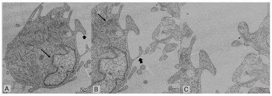Representative TEM images showing 24 h S-MSCs after restoration with complete medium. (A–C) show a well-conserved cellular morphology with a prominent nucleus (arrow); multiple projection (arrowhead) extending to the nearby cells, and some EVs in the extracellular space are detectable (white arrow); some mitochondria in B and MVBs (white arrow). Bar = 2 µm.