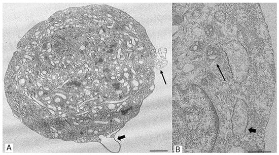 Representative TEM images showing 48 h S-MSCs after restoration. (A) A restored cell with “ghosts” detectable outside the plasmatic membrane (arrow) and bleb (arrowhead), and many vacuoles are also detectable inside cytoplasm. (B) Multiloculated vacuoles (arrowhead) and mitochondria with enlarged cristae (arrow), bar = 1 µm.