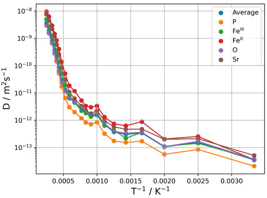 It can be seen that the self-diffusion parameters increase rapidly with rising temperature. The lowest values are evidenced for the P atoms in the glass network sites and the intermediate FeIII, which may occupy network or modifier positions in the glass. In contrast, the highest D values are associated with pure modifiers Sr and FeII.