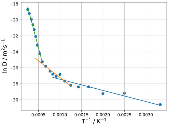 Arrhenius plot of the average self-diffusion coefficient for x = 30 glass (blue line—low-temperature region, orange line—mid-temperature region, green line—high-temperature).
