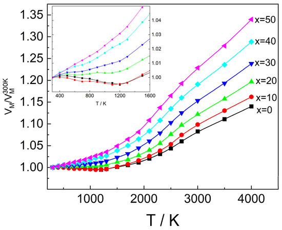 According to the data presented in Figure 5, it can be seen that with increasing SrO content, the molar volume decreases. To better show and describe the change in VM with temperature, the normalized molar volume, defined as the ratio of the VM to the molar volume at 300 K, was calculated and is presented in Figure 6.