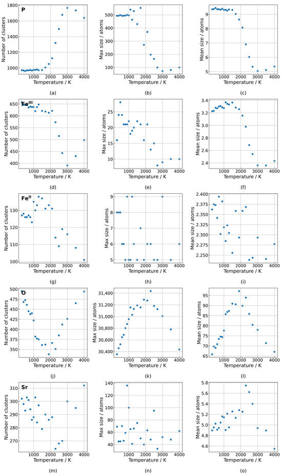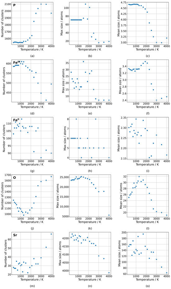 In the case of the glass with low SrO content, the largest number of clusters is associated with the P atoms. In this case, the number, maximum, and average sizes remain constant up to about 1000–1100 K. At higher temperatures, there is evidence of an increase in the number of clusters, accompanied by a decrease in their maximum and mean size. Thus, the phosphate clusters grow smaller and the trend is fast and continuous to about 3000 K, where the parameters stabilize. A similar trend is also observed for glass with high SrO content (x = 40) as shown in Figure 8.