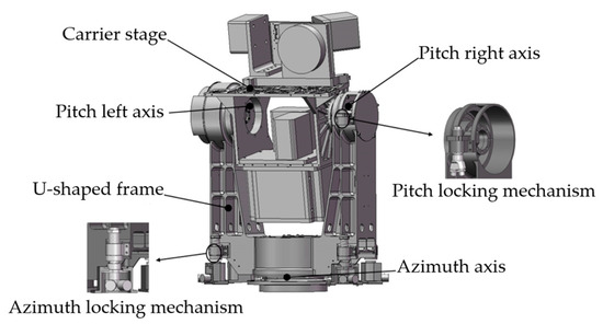 2]. This system is widely applied in the realm of space-based space target detection. Its primary components include azimuth shafting, left and right pitch shafting, support tracking frame, locking mechanism, and carrier stage, to name a few [