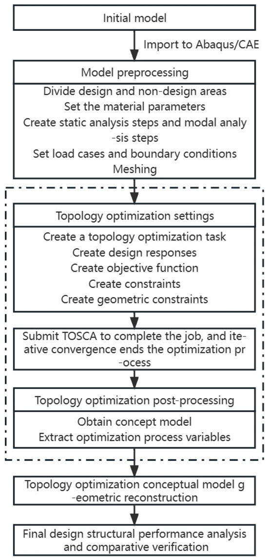 16] (pp. 27–31). Owing to its exceptional performance, TOSCA has been integrated as a topology optimization module within Abaqus/CAE, enabling direct access via the Abaqus graphical user interface. This integration facilitates a closed-loop design process, seamlessly integrating structural finite element simulation and topology optimization.