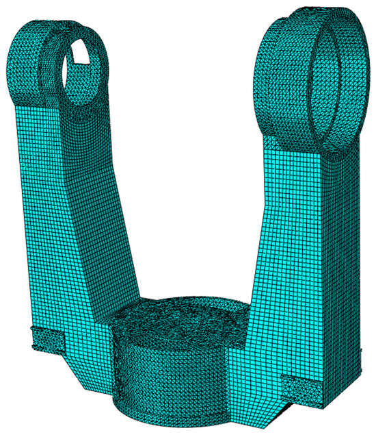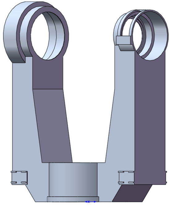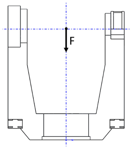 The load on the spaceborne optoelectronic tracking and aiming gimbal primarily stems from the optoelectronic detection equipment attached via the pitch axis. Given that the gimbal system experiences a hyper-gravity state during rocket launches, applying multiplied acceleration loads to the gimbal during ground mechanical tests is a standard practice to guarantee the structural reliability of the gimbal. Therefore, with a 70 kg load and 20 g acceleration as conditions, an equivalent load F for the U-shaped frame is determined. The force is applied at the intersection of the pitch axis hole and the azimuth axis hole, featuring a magnitude of 14,000 N and a direction vertically downward. The simplified mechanical model of the gimbal’s U-shaped frame is depicted in