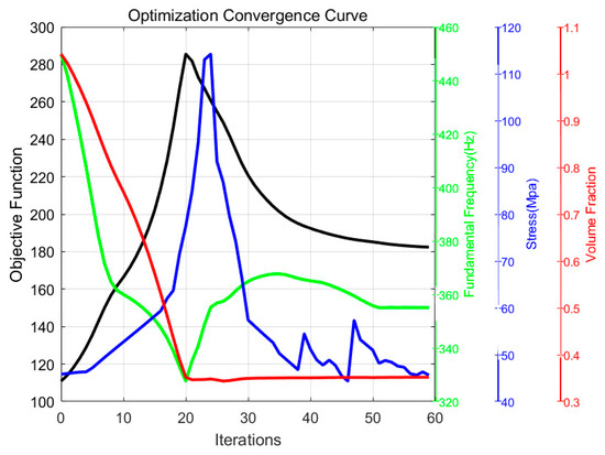 Figure 9 shows the convergence curves of the objective and constraint functions during the topology optimization process.