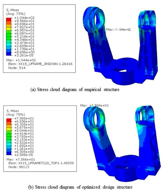 Finite element analysis results reveal that under identical working conditions and mesh quality, the empirical design structure’s maximum stress value stands at 104.4 MPa, whereas the optimized design structure demonstrates a maximum stress of 75.66 MPa, marking a reduction of 28.74 MPa. This indicates that the U-shaped frame, utilizing the optimized design structure, exhibits enhanced static stiffness.