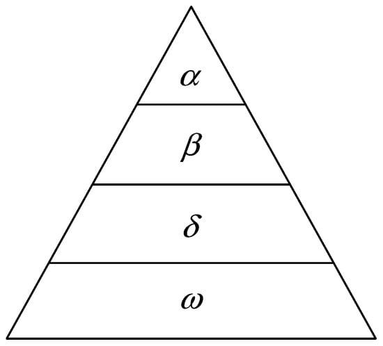 GWO imitates the way wolves hunt in nature to construct its unique social hierarchy level model []. As shown in Figure 1, wolves are divided into four social classes α, β, δ and ω, according to the fitness values of individuals in the wolf pack. Among them, α wolf is the leader in the wolf pack; β wolf is in the sub-leader position in the wolf pack and is responsible for assisting α wolf; δ wolf is responsible for observing the surrounding environment and detecting the location of the prey in the wolf pack; and ω wolf is an ordinary member of the wolf pack, following the guidance of the leader wolf for hunting [,].