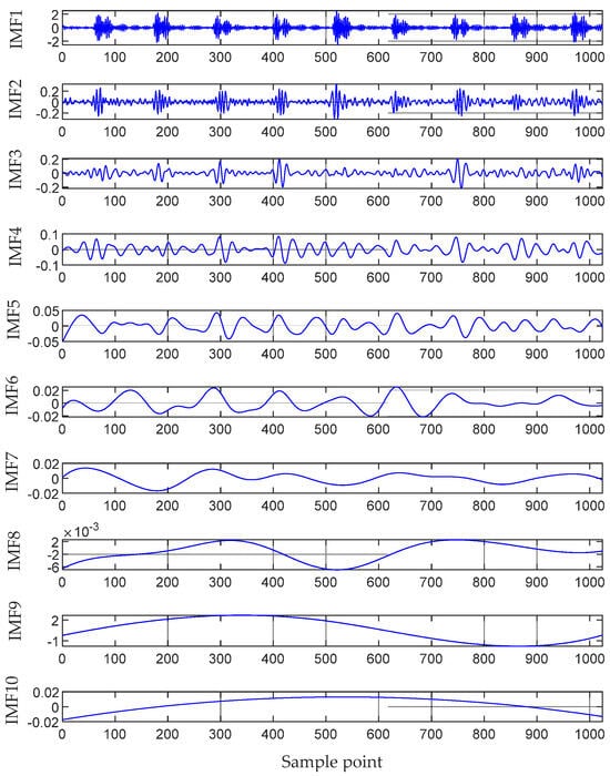 Secondly, the CEEMDAN algorithm is used to decompose the seven labelled samples into the corresponding IMF components, and the decomposition results are shown in Figure 5, taking one sample with label 4 as an example.