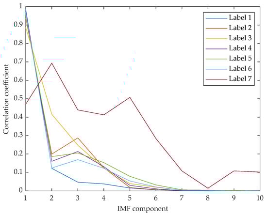 The correlation coefficient plots of each IMF component for the seven labels are shown in Figure 6. From the figure, it can be learnt that the correlation coefficient value decreases with the increase in the number of layers of decomposition and the first five IMF components have high correlation coefficient values. Therefore, the first five IMF components are selected for signal reconstruction to obtain the signal after noise reduction.