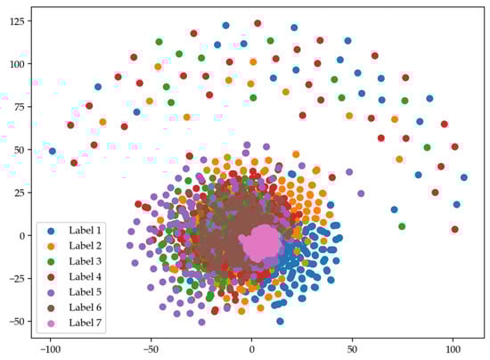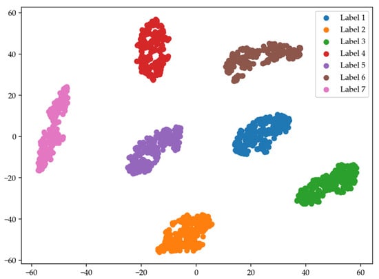 The t-SNE is a stream-learning algorithm for the visualisation of high-dimensional data. It preserves the local structure in the original data by converting the similarity between data points into a probability distribution and finding a similar probability distribution in the low-dimensional space. The t-SNE algorithm projects the high-dimensional feature space into a two- or three-dimensional space for intuitive analysis and visualisation. Figure 7 shows the CNN input layer data visualisation results and Figure 8 shows the CNN output layer data visualisation results.