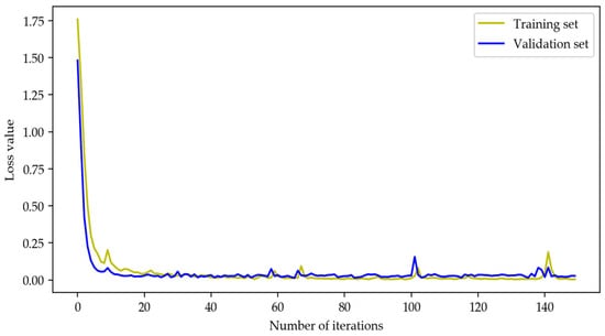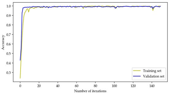The model hyperparameters were set as follows: the initial learning rate was set to 0.001; the ReLU function was used as the activation function of the network; the cross-entropy function was used as the loss function; the batch size in the training was set to 64; the number of iterations was set to 150; the deactivation rate of dropout was set to 0.2; and the Adam optimiser was used to update the network parameters.