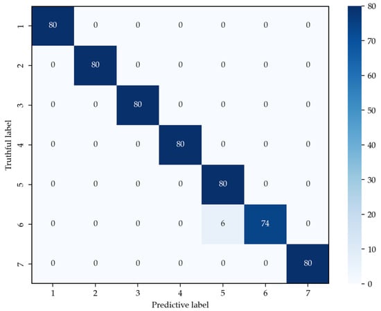 The CNN-SVM model test set fault diagnosis results are shown in Figure 11. From Figure 11, it can be concluded that six samples with true label 6 in the confusion matrix are incorrectly classified as label 5 and the final fault classification accuracy of 98.93% is obtained after calculation.