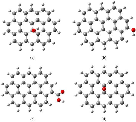 Structural model of GO with different functional groups in steady state: (a) GO(OH)s, E = −1303.8118 Hartree; (b) GO(OH)b, E = −1303.2840 Hartree; (c) GO(COOH), E = −1416.6408 Hartree; (d) GO(O), E = −1304.3372 Hartree.