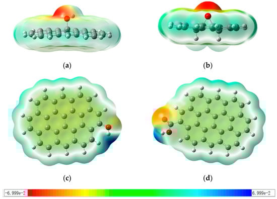 Oxygen-containing functional groups on GO also play an important role in the adsorption of metal ions. By calculating the electrostatic potential of GO containing different functional groups in a stable configuration, it was found that the graphene sheet is mainly positively charged, while the oxygen atoms in the oxygen-containing functional groups on it are surrounded by negative areas. Among all functional groups, the oxygen atoms on the epoxy group are the most electronegative, followed by hydroxyl, carboxyl and base-edge hydroxyl groups. The more electronegative the group is, the easier it is to bond with metal cations. The electrostatic potential diagram of GO containing different functional groups in a stable configuration is shown in Figure 3.