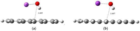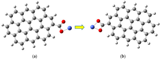(2) With the increase in temperature, the structure of [GO(O)s…Co]+ and [GO(O)…Co] also underwent similar changes, from Co2+ connected to GO through hydroxyl oxygen atoms at 20 °C and 30 °C to the structure of Co2+ and the hydroxyl group separated from the graphene sheet, as shown in Figure 5.