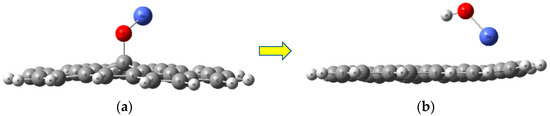 In order to analyze the influence of different types of functional groups on the adsorption process in the subsequent calculation, GO models containing different types of functional groups should be constructed. To simplify the calculation, it is assumed that each GO molecule contains only one functional group, that is, a hydroxyl group, carboxyl group or epoxy group, where the hydroxyl group exists on the base plane and on the edge of the base plane. The structure and energy of GO configurations containing different types of functional groups in the stable state are shown in Figure 2. The hydroxyl group is denoted as GO(OH)s when it is present at the base level and GO(OH)b when it is present at the edge of the base level;