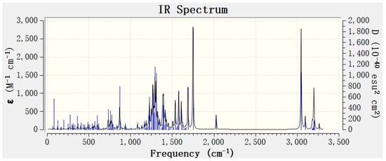 As is shown in Figure 8, the GO only containing hydroxyl and carboxyl groups was constructed using Gaussian16 software, and the infrared spectra in its stable configuration were calculated. By examining the vibration modes of oxygen-containing functional groups on GO, it can be observed that the absorption peaks at 1295.59 cm−1 and 1689.70 cm−1 correspond to the deformation vibration of -OH. The absorption peak at 1750.79 cm−1 corresponds to both the deformation vibration of -OH and the stretching vibration of -C=O in the carboxyl groups. Additionally, at 3048.38 cm−1, an absorption peak arises from superimposed stretching and deformation vibrations of -OH.