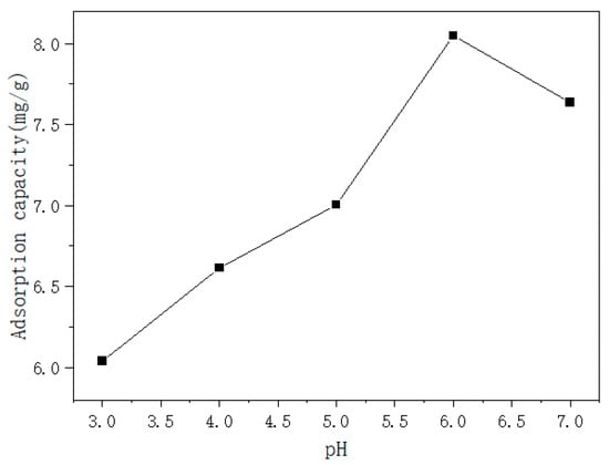 Under the conditions of initial concentration c0 = 10 mg/L, adsorption temperature T = 30 °C and adsorption time t = 3 h, the effect of pH on the adsorption of Co2+ by GO is shown in Figure 10. In the acidic range, the adsorption capacity also increases gradually with the increase in pH. When pH = 6, the adsorption capacity of Co2+ by GO is 8.04875 mg/g, which is consistent with the Gaussian simulation results.