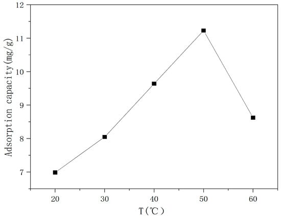 Under the conditions of pH = 6, c0 = 10 mg/L and t = 3 h, the influence of temperature on the adsorption of Co2+ by GO is shown in Figure 11. When the temperature ranges from 30 °C to 60 °C, the adsorption capacity of GO for Co2+ reaches the highest value at 50 °C, which is 11.23 mg/g, indicating the uncertainty of the effect of temperature on the adsorption effect.