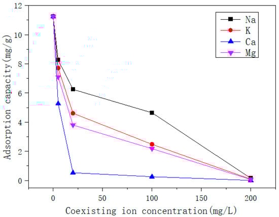 The effects of the co-existence of Na+, K+, Ca2+ and Mg2+ on the adsorption of Co2+ by GO were investigated at 50 °C. During the adsorption process, pH = 6, t = 3 h and the initial concentrations of Co2+ c0 = 10 mg/L; the results are shown in Figure 12. It can be seen that Na+, K+, Ca2+ and Mg2+ contained in the solution have an inhibitory effect on the adsorption of Co2+ on GO. With the increase in the concentration of interfering ions in the solution, the equilibrium adsorption capacity of GO for Co2+ decreases rapidly at first and then gradually slows down until it approaches 0. The above experimental phenomenon further shows that some functional groups on GO can also bind to the above co-existing ions, which will have a certain effect on the adsorption of Co(II).