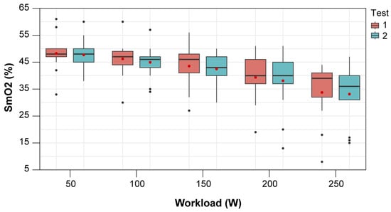 Distribution of muscle oxygen saturation percentage levels (SmO2) by workload and test. The boxplots show the distribution of SmO2 (y-axis) measured at different workloads (x-axis) of 50, 100, 150, 200, and 250 W for two different tests. Each workload is represented twice, corresponding to Test 1 and Test 2, respectively. The horizontal lines within each box represent the medians, while the red points and error bars indicate the means and their corresponding 95% confidence intervals. The individual points outside the boxes represent data points that are either outliers or leverage points.