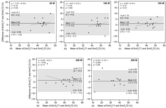 The Bland–Altman analysis revealed a small bias for SmO2 at intensities of 50 W (0.54%), 100 W (1.31%), 150 W (1.08%), 200 W (1.31%), and 250 W (0.61%) (Figure 3). Limits of agreement were approximately ±5% for all workloads, with the exception of 150 W, which demonstrated slightly higher variability (±6.1%). The majority of data points fell within the LoA, suggesting a strong concordance between the two tests. This pattern indicates that the differences observed between the first and second test measurements are minimal and fall within an acceptable tolerance range. The regression analysis of these differences produced equations characterized by low slopes (ranging from 0.002 to 0.21), accompanied by Pearson’s correlation coefficients approaching null values (ranging from 0.04 to 0.31), all with p-values exceeding 0.05. Consequently, these results suggest an absence of a systematic bias in the measurement differences as the magnitude of the SmO2 varies.