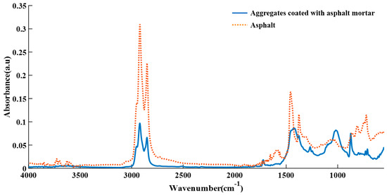To compare the difference between the FTIR spectra of aggregates coated with asphalt mortar and asphalt, the spectra of JL-70 neat asphalt were also recorded referring to the common ATR-FTIR testing process of asphalt [35].