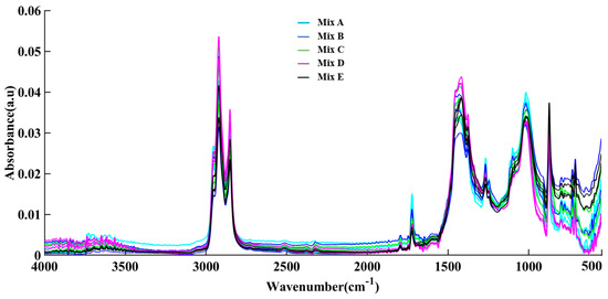 To further study the effect of the heterogeneity of aggregates coated with asphalt mortar on its spectrum, 15 spectra of the five samples were measured by ATR-FTIR technology as shown in Figure 7, which is drawn by Matlab software. It can be seen from Figure 7 that the spectral shapes and peak positions of the five samples obtained from the same batch of asphalt mixture fabricated at the same time across the entire mid-infrared region are very similar. However, the peak intensities from the five samples are significantly different, among which the difference in Mix D is the smallest and that in Mix B is the largest.