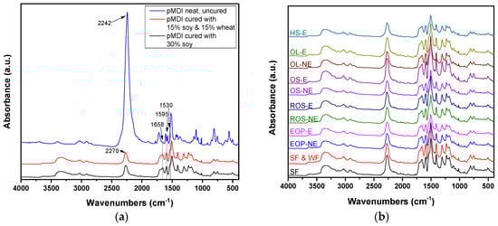 Figure 1a shows the ATR-FTIR spectrum collected from the neat and uncured pMDI together with the spectra of cured pMDI adhesive mixtures with soy, and with soy and wheat. Neat and uncured pMDI presents all the characteristic bands as supported in numerous references [38,39,40]. The difficulty to observe FTIR bands in the 2300–2200 cm−1 region is noted, due to the diamond ATR accessory that was employed for the collection of the spectra. For this reason, the isocyanate band at 2278 cm−1—according to the bibliography—is biased and located at 2242 cm−1.