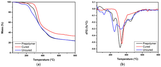 Figure 2 shows the TGA curves of mass loss and its derivative for the adhesive mixture of pMDI with 30% soy flour. The adhesive mixture was studied immediately after combining its ingredients (uncured), two hours after its preparation (prepolymer) and after its curing (cured). The uncured adhesive mixture presents a 7% mass loss up to 160 °C, which is attributed to humidity. Several local maxima of the mass loss rate can be observed, which correspond to its unreacted ingredients, such as the degradation of pMDI at 245 °C, the degradation of MDI monomers at 430 °C, and, finally, the degradation of the remaining isomers of MDI at 500 °C [41]. Moreover, and due to the soy flour, two additional local mass loss rate maxima are reported, at ~350 °C, due to starch and protein decomposition [30,42]. Regarding the cured adhesive mixture, its decomposition presents a mass loss rate maximum at 344 °C, in accordance with the literature [43]. Finally, the prepolymer presents a mass loss of 0.5% due to humidity up to 160 °C, which indicates that the moisture content of soy flour is immediately consumed as pMDI starts to cure. This is supported from the major step of degradation that the three analyzed samples present; their corresponding maxima of mass loss rate are located at 250, 322, and 343 °C for the uncured, the prepolymer, and the cured mixture, respectively.
