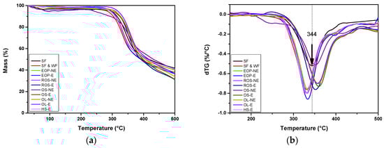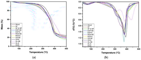 The TGA performed on material removed from the middle veneer of each plywood panel manufactured with the adhesive mixtures under study is presented in Figure 7. In every case, the thermal degradation of the adhesive mixtures follows that of the wood, as it was impossible to extract just the adhesive mixture that was cured between the veneers; following this, the mass loss and dTG curves of the plain wood veneer are shown for comparative reasons [45]. A slight mass loss due to humidity that does not exceed 3.5% is reported up to 160 °C. All the samples present a local maximum in the mass loss rate at about 375–390 °C due to wood degradation predomination and, in particular, the cellulose decomposition. Plain wood is considered as the most thermally stable one from all the samples under study, as its thermal decomposition maximum is located at 390 °C. The samples containing adhesive mixtures with olive tree residues, and especially that with residual olive skin (ROS) and olive stone (OS), present a somewhat better thermal stability in comparison with the other glue mixtures, with local degradation maxima above 380 °C. It should be mentioned that although all the adhesive mixtures—as collected from the wooden panels after their curing—present similar thermal characteristics, the one composed of extracted hemp seeds (HS-E) differs, as it presents two more local degradation maxima, at 310 and 439 °C. The first one is also observed in other adhesive mixtures, mainly the one with olive leaves (OL-NE), and can be related with the depolymerization of hemicellulose, cellulose, lignin, and pectins, which are associated with the agriculture residues under study [46]. The latter could be associated with lignin pyrolysis or the decomposition of char residues [47].