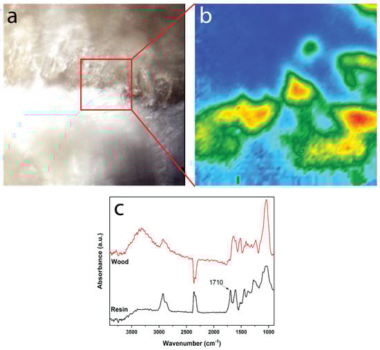 Figure 5 presents the FPA micro-FTIR analysis of the cross-section of the plywood panel manufactured with the heartwood non-extracted adhesive mixture. The analysis was performed in micro-ATR mode, using a germanium crystal which does not affect the 2400–2000 cm−1 area as a diamond one. The FPA chemical image of the area of interest is indicated in Figure 5a and presented in Figure 5b, showing the intensity of the band at 1710 cm−1 in a color scale from blue (absence of band) to red (most intense). The band at ~1710 cm−1 is attributed to urethane linkages (R-NH-COOR) that are formed, due to the reaction of the isocyanate groups with hydroxyls [38]. The glue mixture is distributed in the bonding line, within a 20 μm thickness. The micro-ATR spectrum of the glue mixture (Figure 5c) shows that the isocyanate group is fully consumed, as no band is noted at ~2240 cm−1, except from the bands at 2400–2300 cm−1 due to atmospheric CO2.