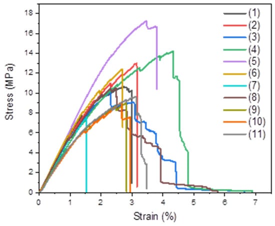 Flexural stress–strain curves of the plywood panels made with the following: (1) pMDI/SF (control 1), (2) pMDI/SF/WF (control 2), (3) pMDI/SF/EOP-NE, (4) pMDI/SF/EOP-E, (5) pMDI/SF/ROS-NE, (6) pMDI/SF/E, (7) pMDI/SF/OS-NE, (8) pMDI/SF/OS-E, (9) pMDI/SF/OL-NE, (10) pMDI/SF/OL-E, and (11) pMDI/SF/HS-E.
