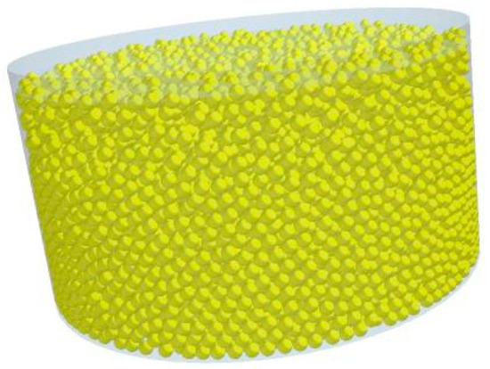 The excitation frequency range is 5–300 Hz, and the excitation intensity is 0–10. The excitation amplitudes is characterized by reduced acceleration. The expression is , where is the vibration amplitude, is the vibration angular frequency, and the is the gravity acceleration. In this excitation range, the particles generally have five typical vibration states: solid-like, micro-vibration state, medium vibration state, strong vibration state, and gas-like state. The internal vibration state and energy transfer process of the particles under different excitations are obtained by the discrete element method, as are the internal velocity distribution and kinetic energy distribution of the particles under different vibration conditions. The velocity distribution of the particles reflects the energy transfer process and energy distribution characteristics inside the particles after excitation. The particles generate velocity and collision friction through interaction and generate thermal energy consumption and other energy consumption forms through collision and friction. Therefore, the discrete element simulation software EDEM2021 is used to establish the discrete element simulation analysis model of particle thermal energy consumption, as shown in Figure 1. The particle mass is 557 g, the particle size is 2 mm, the filling rate is 80%, and the particle container is a cylindrical container. The setting of discrete element simulation parameters is shown in Appendix A.