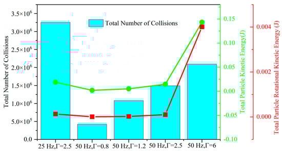 Figure 3 shows the relationship between total particle kinetic energy, total particle rotational kinetic energy, and the total number of collision times in a cycle under different excitation conditions. The number of collisions reflects the intensity of collisions in a period between particles. The ‘force chain’ is constantly generated between particles and breaks, and the corresponding energy is continuously dissipated. The changes in translational kinetic energy and rotational kinetic energy reflect that the particles will produce collision and friction under different excitation conditions, and the translational kinetic energy between the particles is dominant. Through the discrete element analysis, it can be seen that the particles will show different energy distributions under different vibration states, and the distribution of this energy will affect the thermal energy dissipation of the particles.